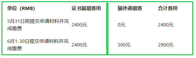 请注意:5月31前办理属于正常办理,6月1日-6月30日费用需在加500元逾期费!如果您不知道您证书效期,文末添加天九湾阿福微信协助您查询。